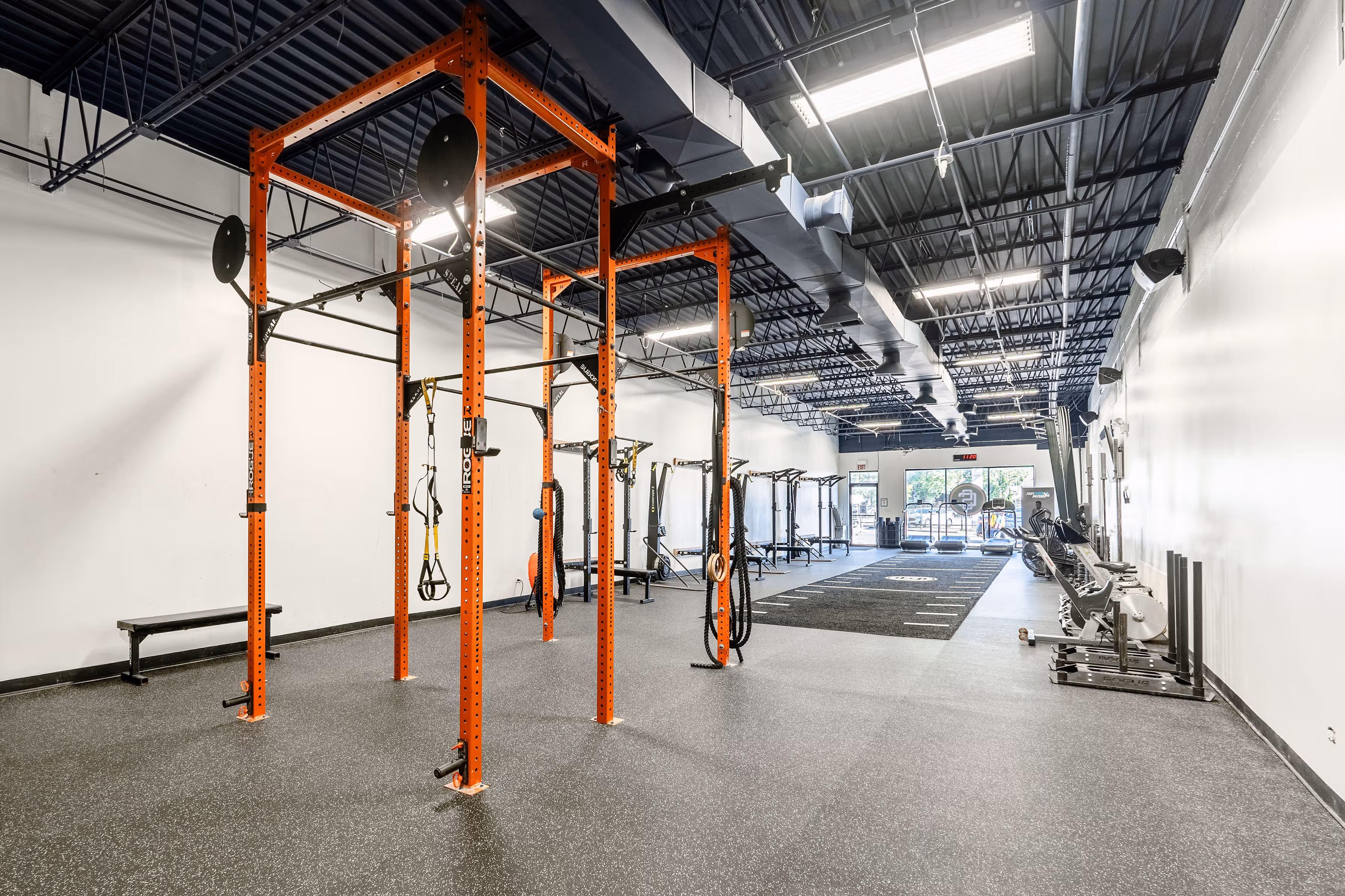 Custom Features: Bespoke elements like wall-mounted storage for shoes, weights, and yoga mats, and personalized design touches (e.g., branded colors, motivational art).