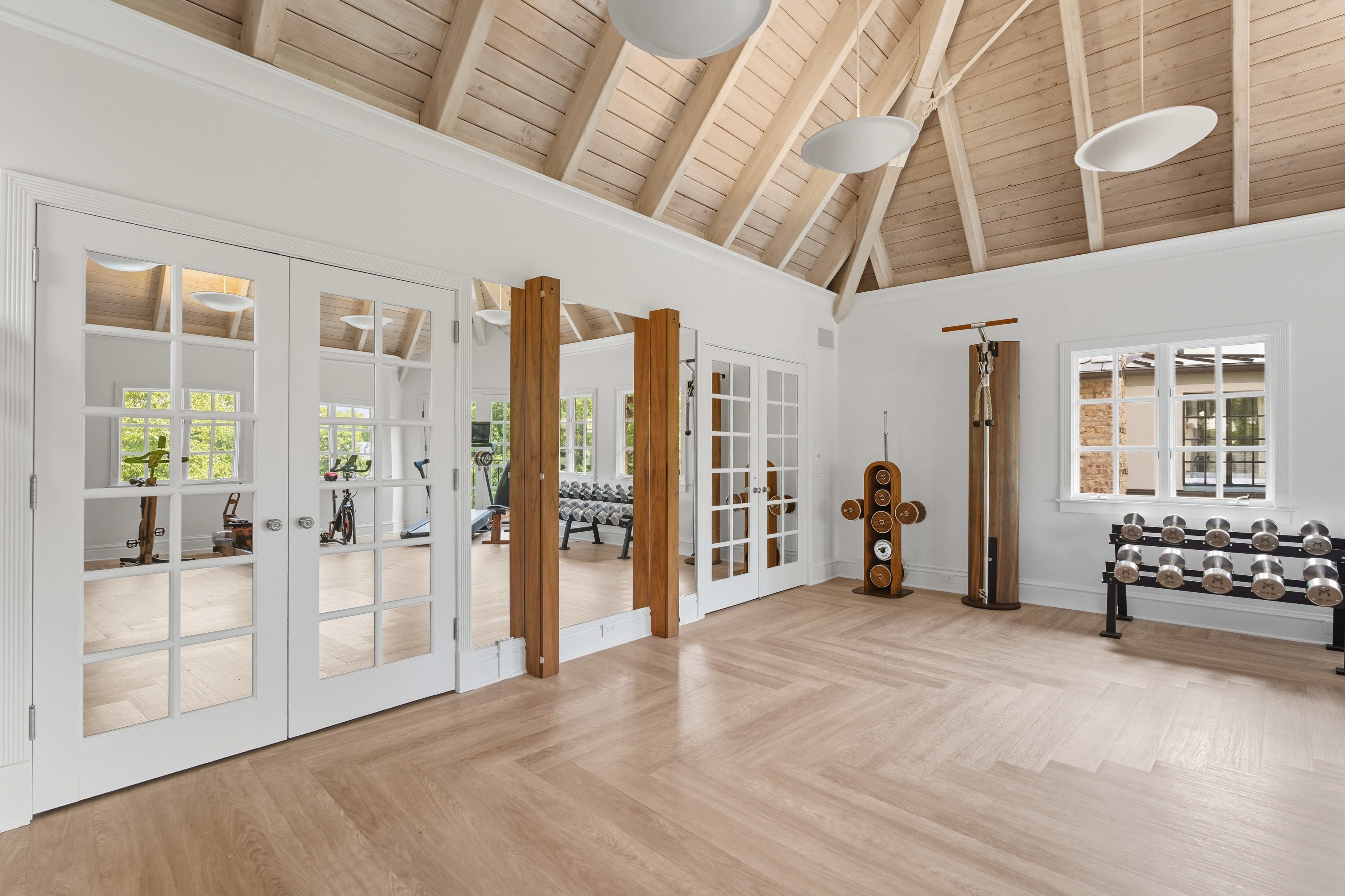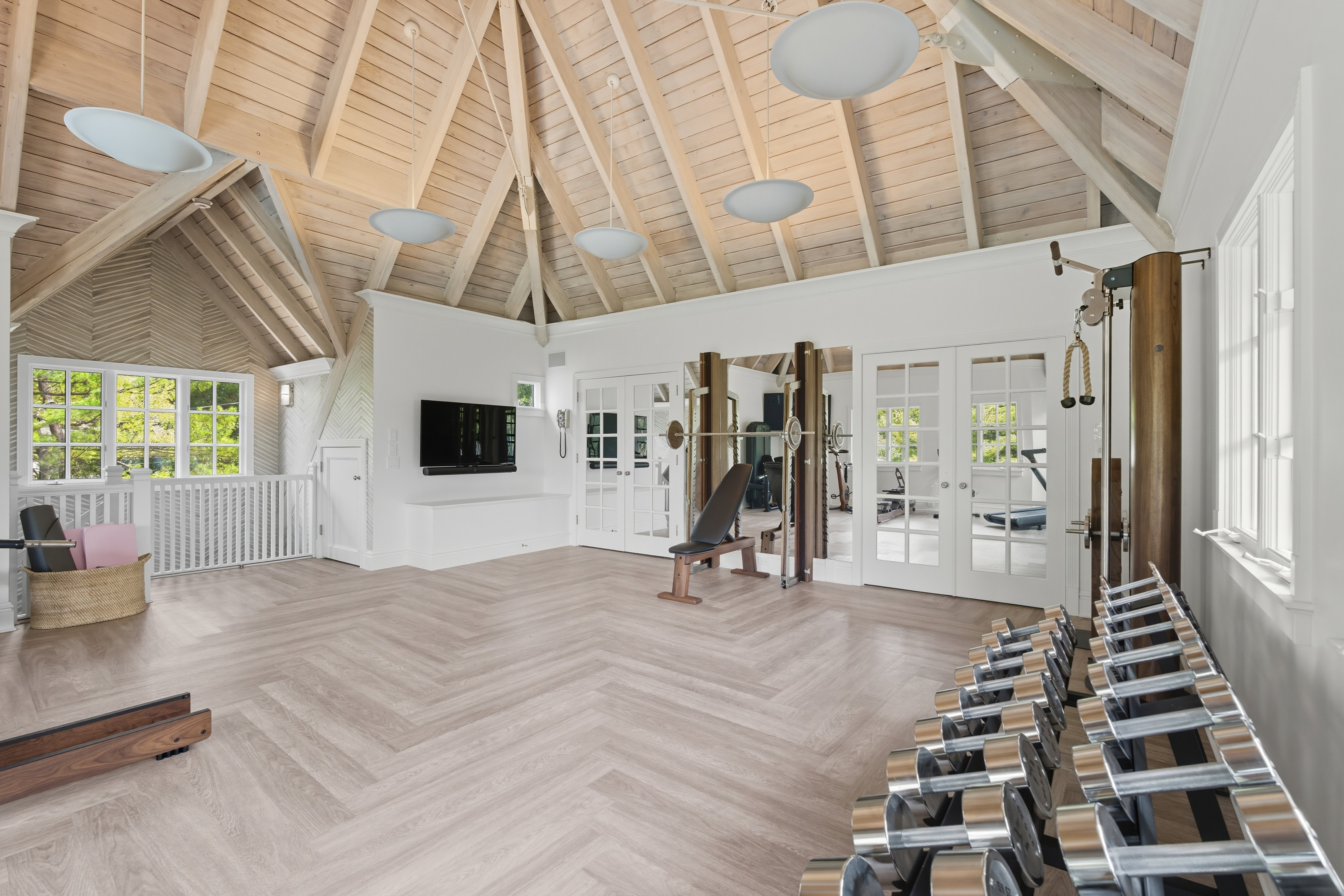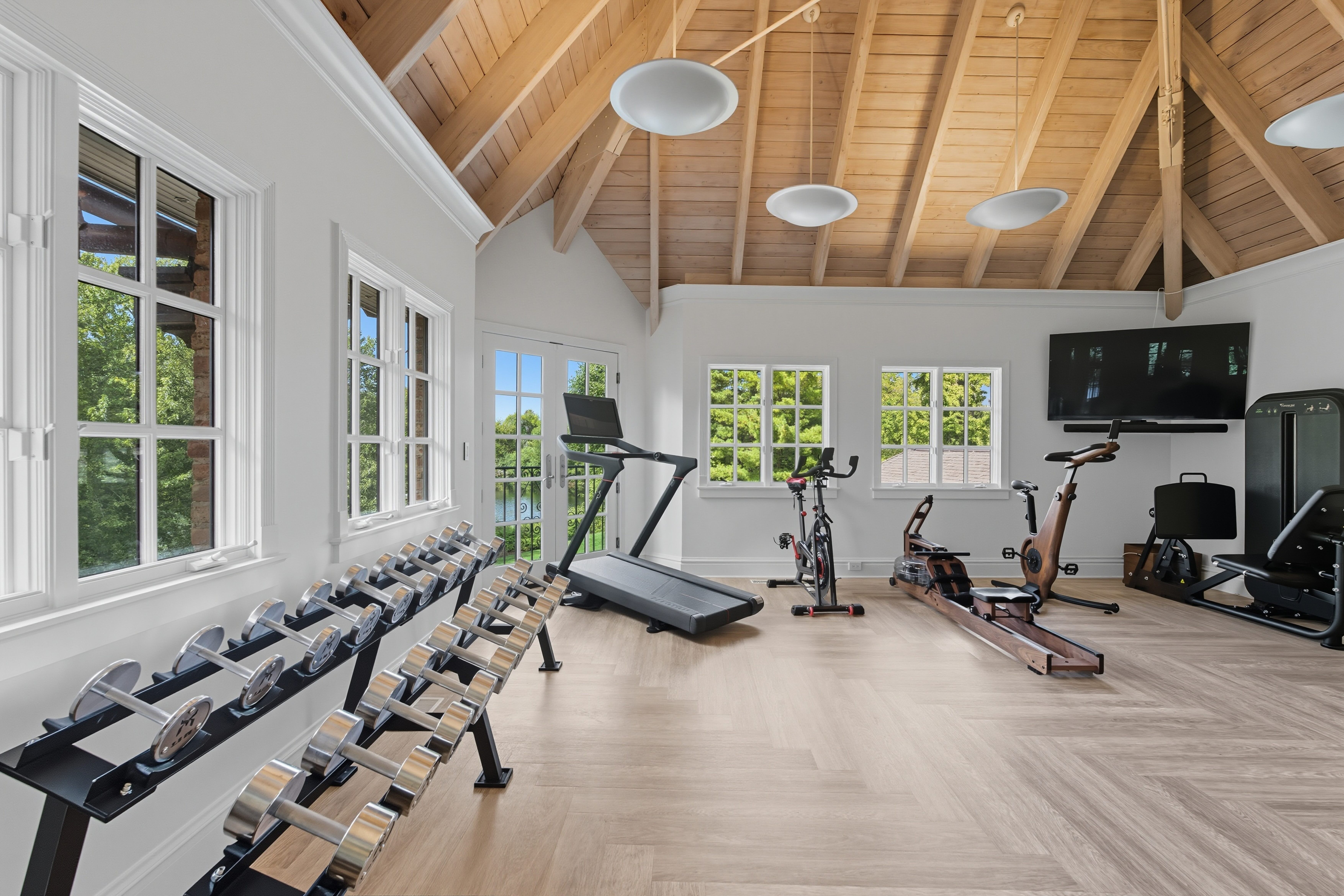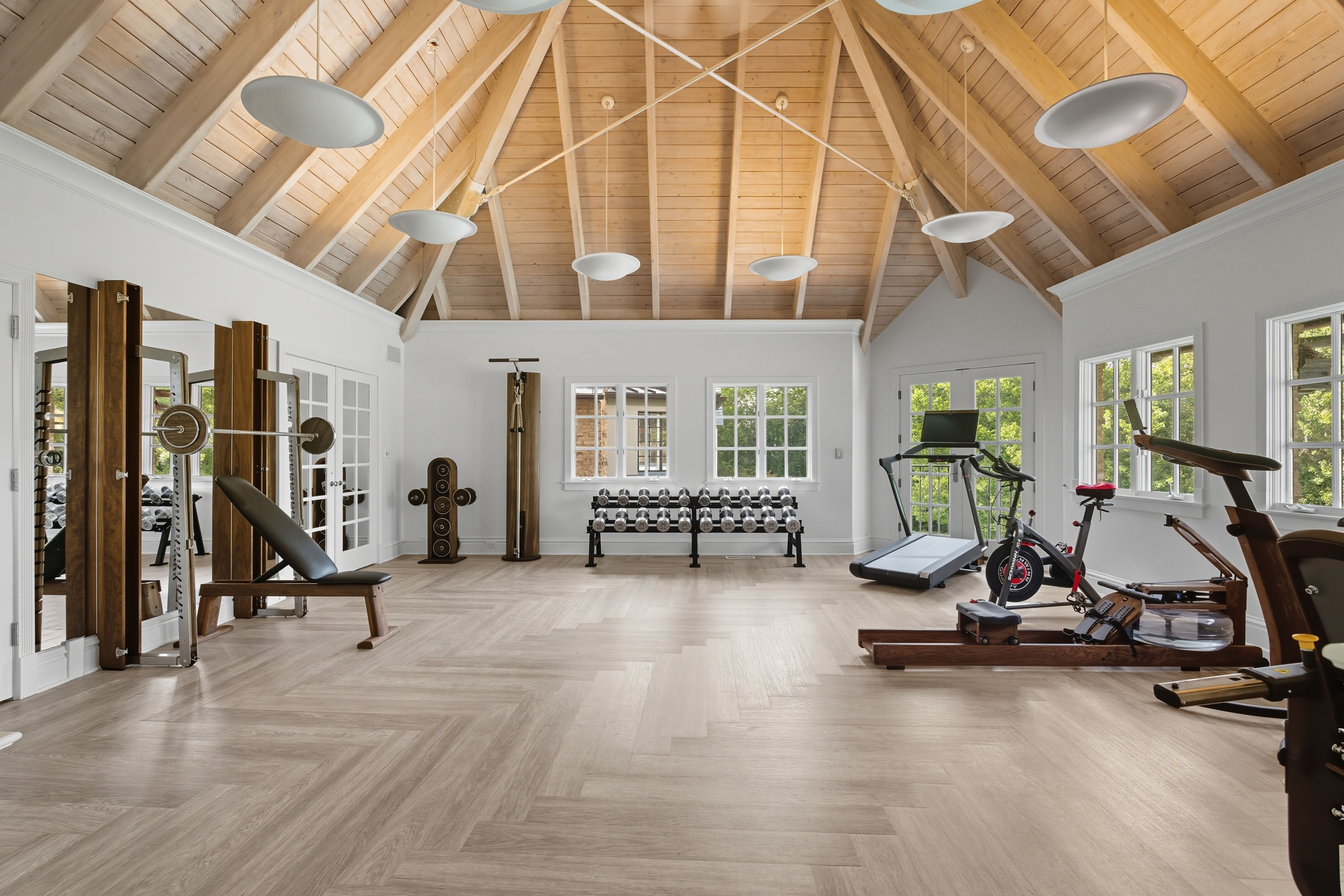 There is so much beauty in this room- everything pulls you right in and makes you want to spend time in this space- the high vaulted wood beamed ceilings, the stunning equipment, and the beautiful water view.