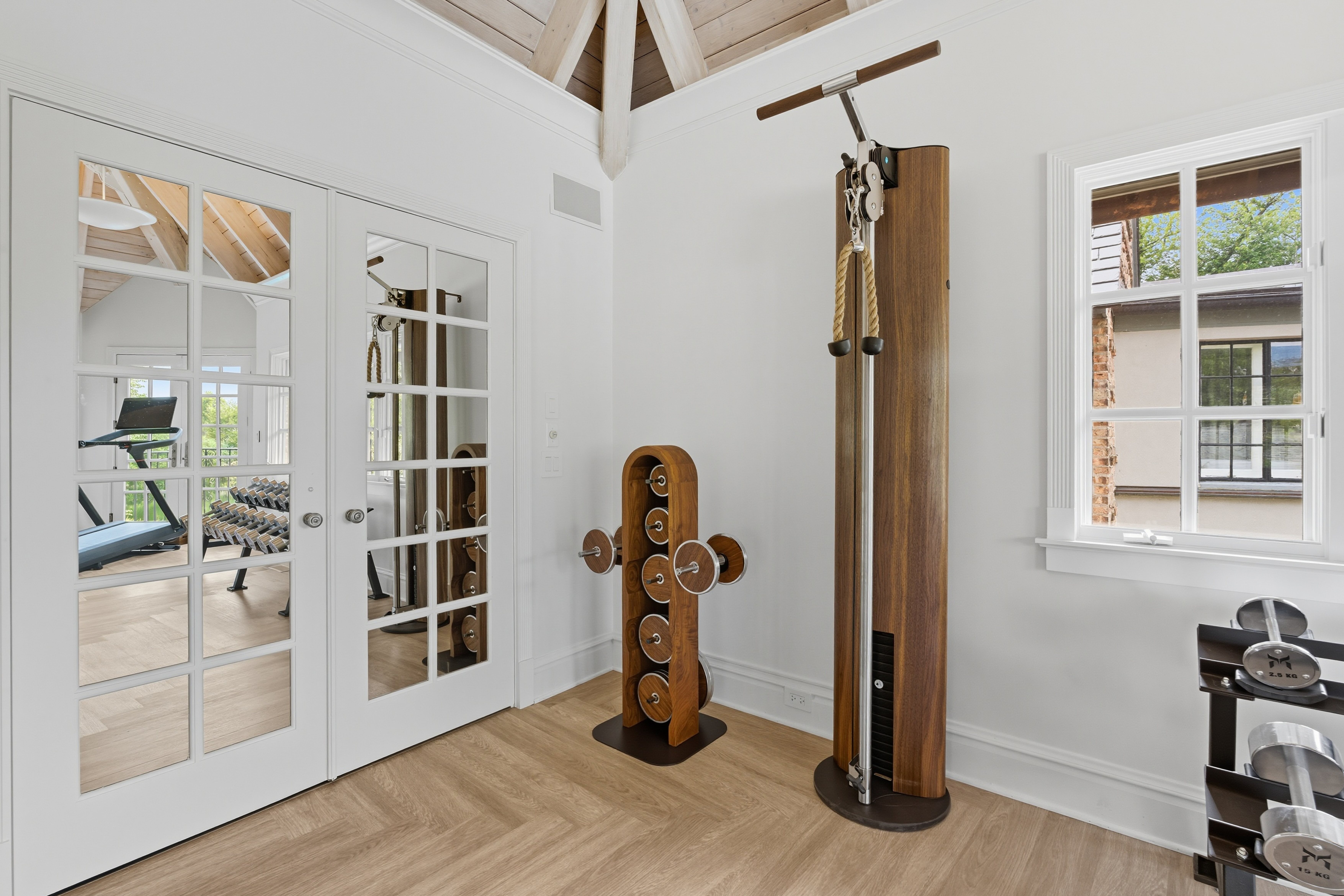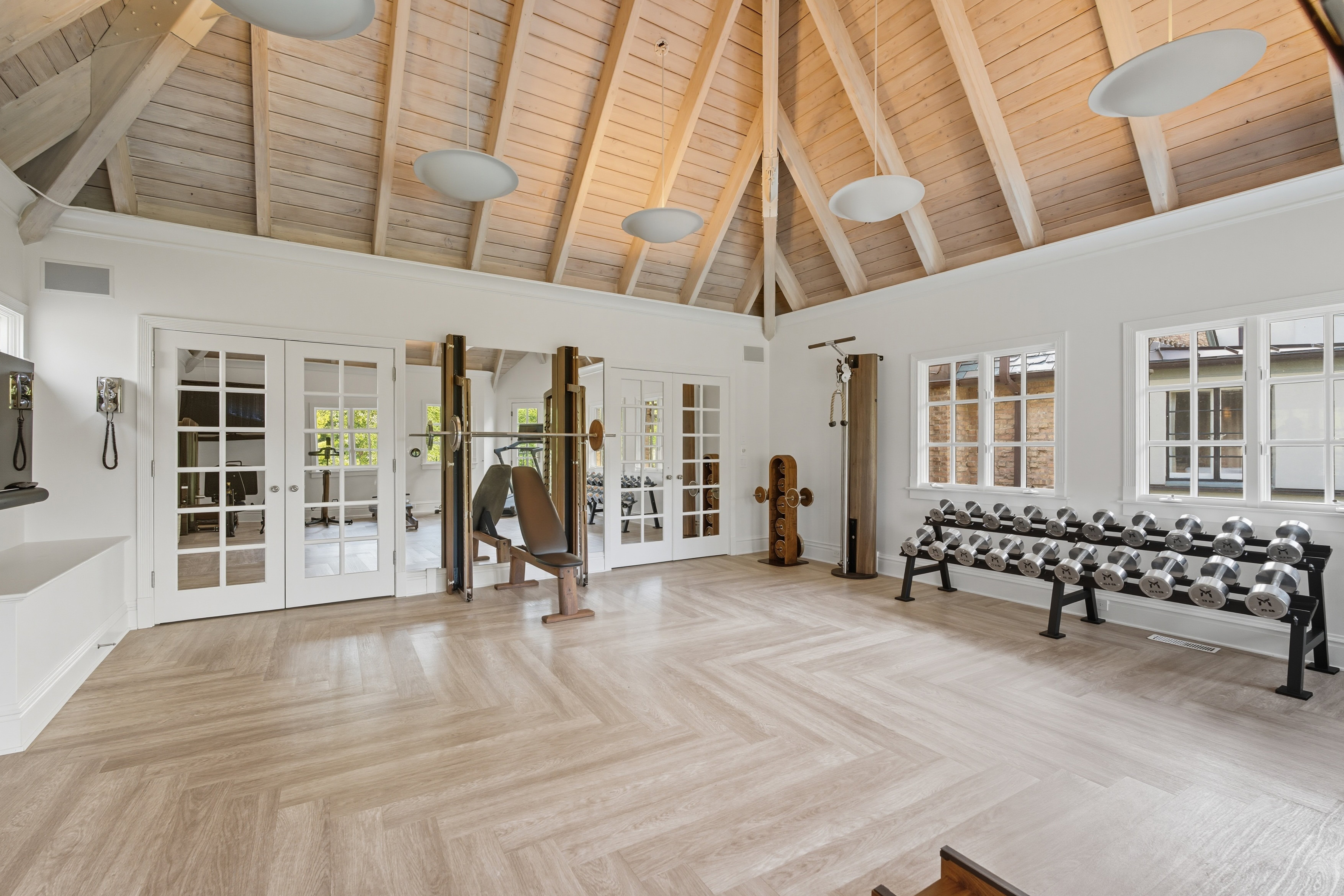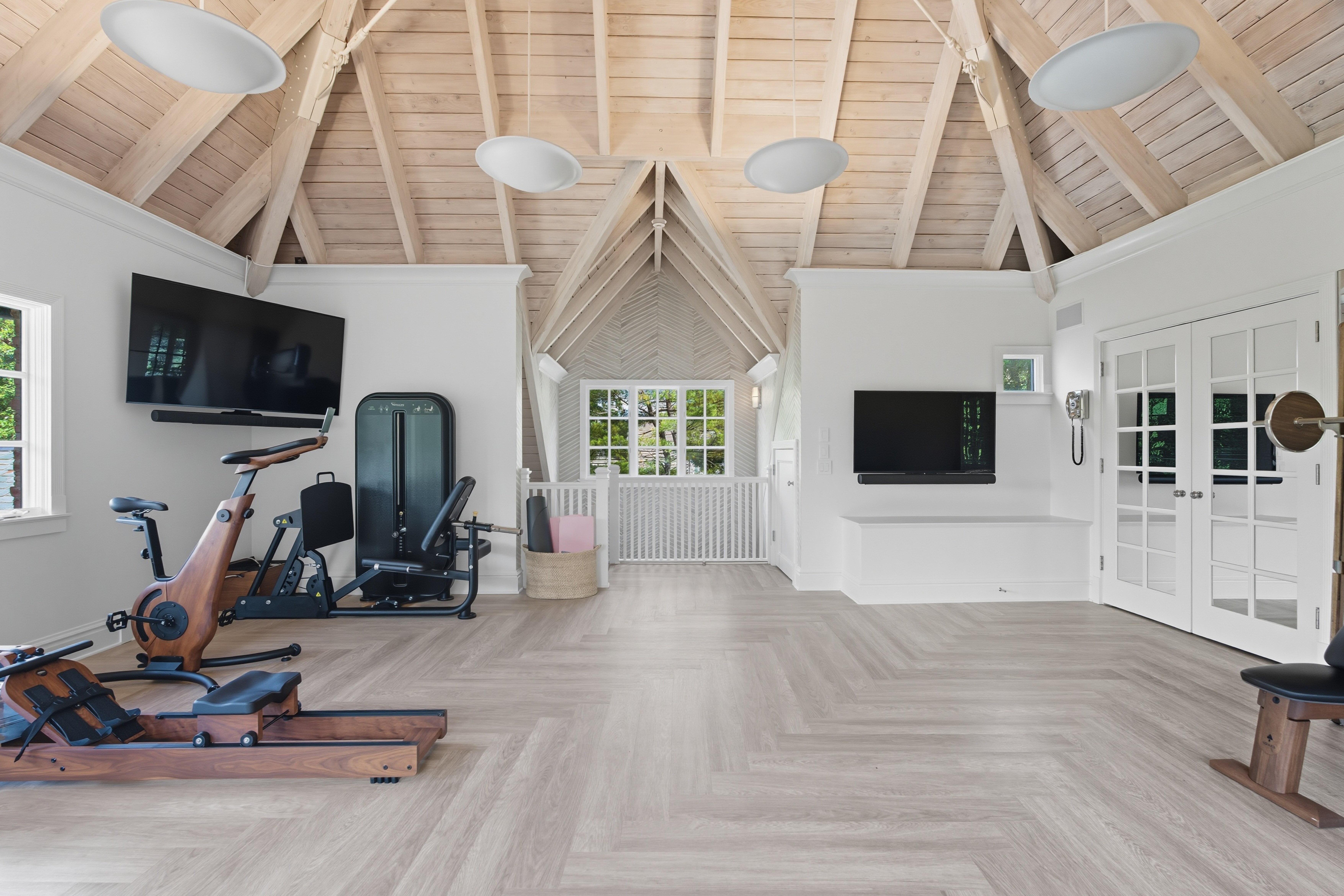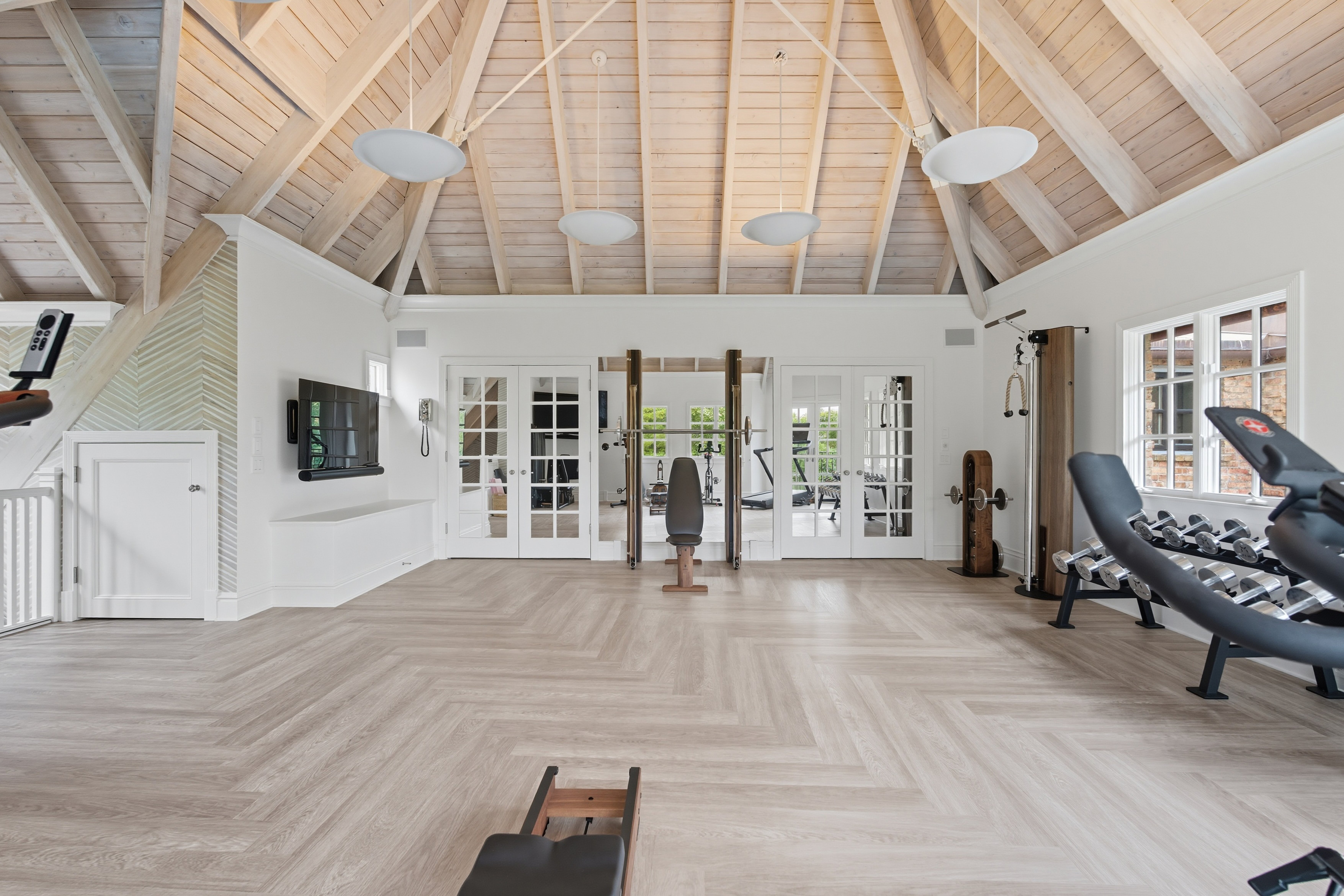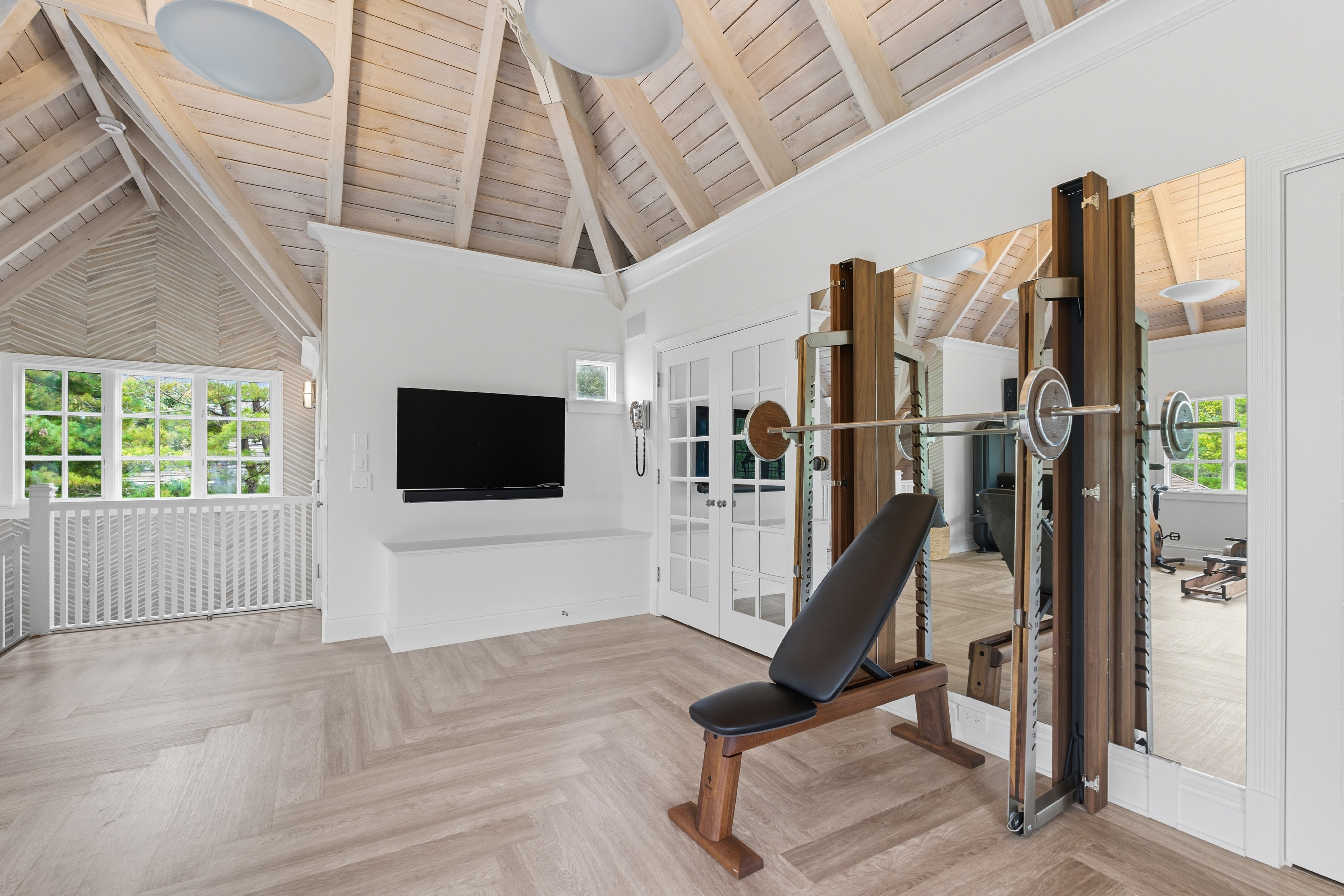 There is so much beauty in this room- everything pulls you right in and makes you want to spend time in this space- the high vaulted wood beamed ceilings, the stunning equipment, and the beautiful water view.